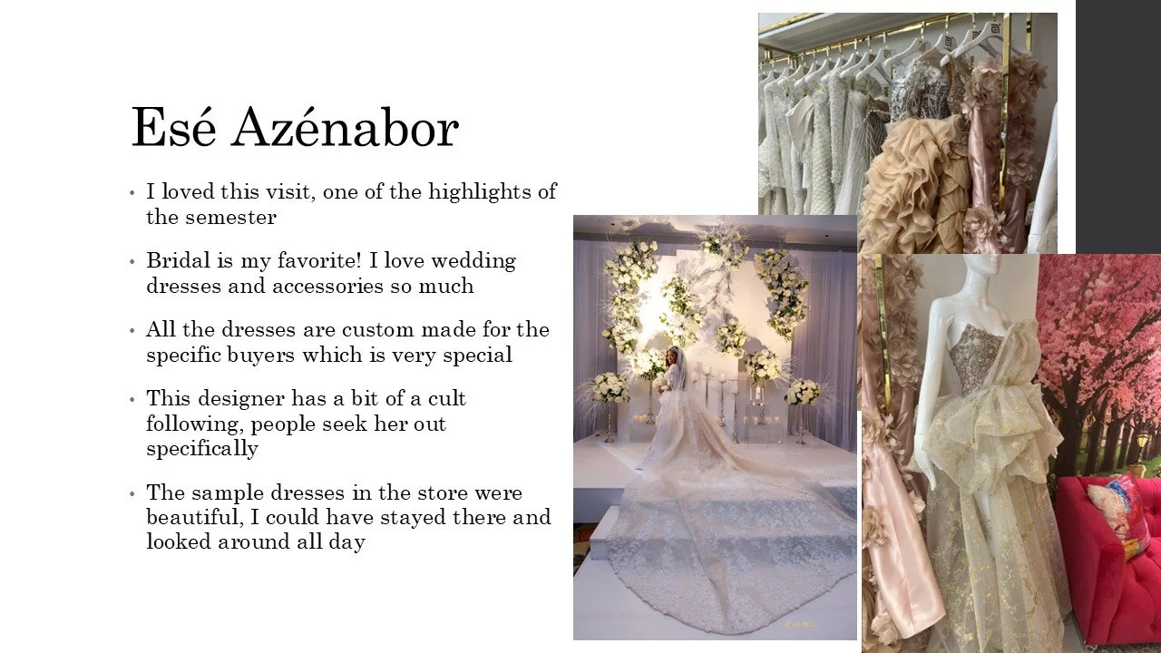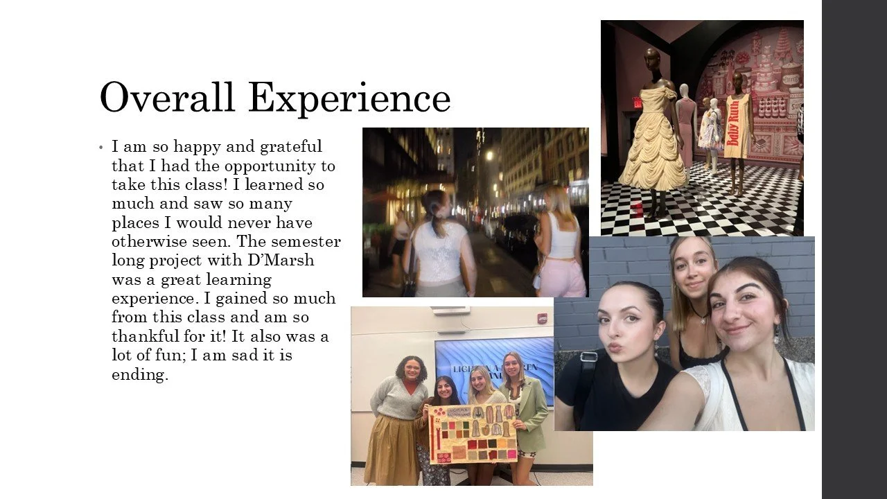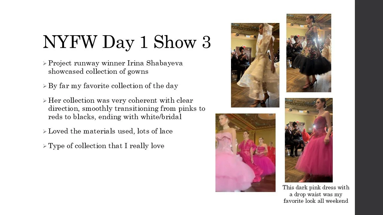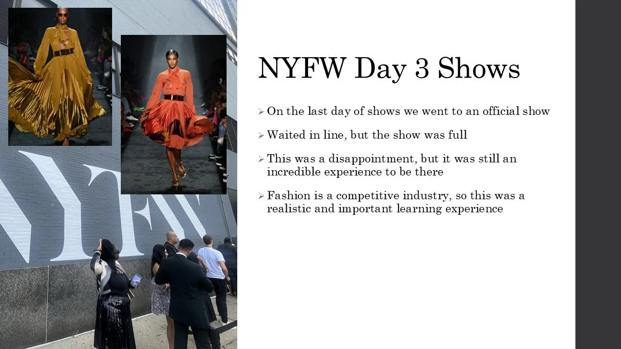Approximately every other Friday of my fall semester, the New York Fashion Immersion class would travel to New York City for the day and visit various locations and people. We took a four day long trip during New York Fashion Week as our first trip. This Digital Journal was used to track and reflect upon each of our visits.