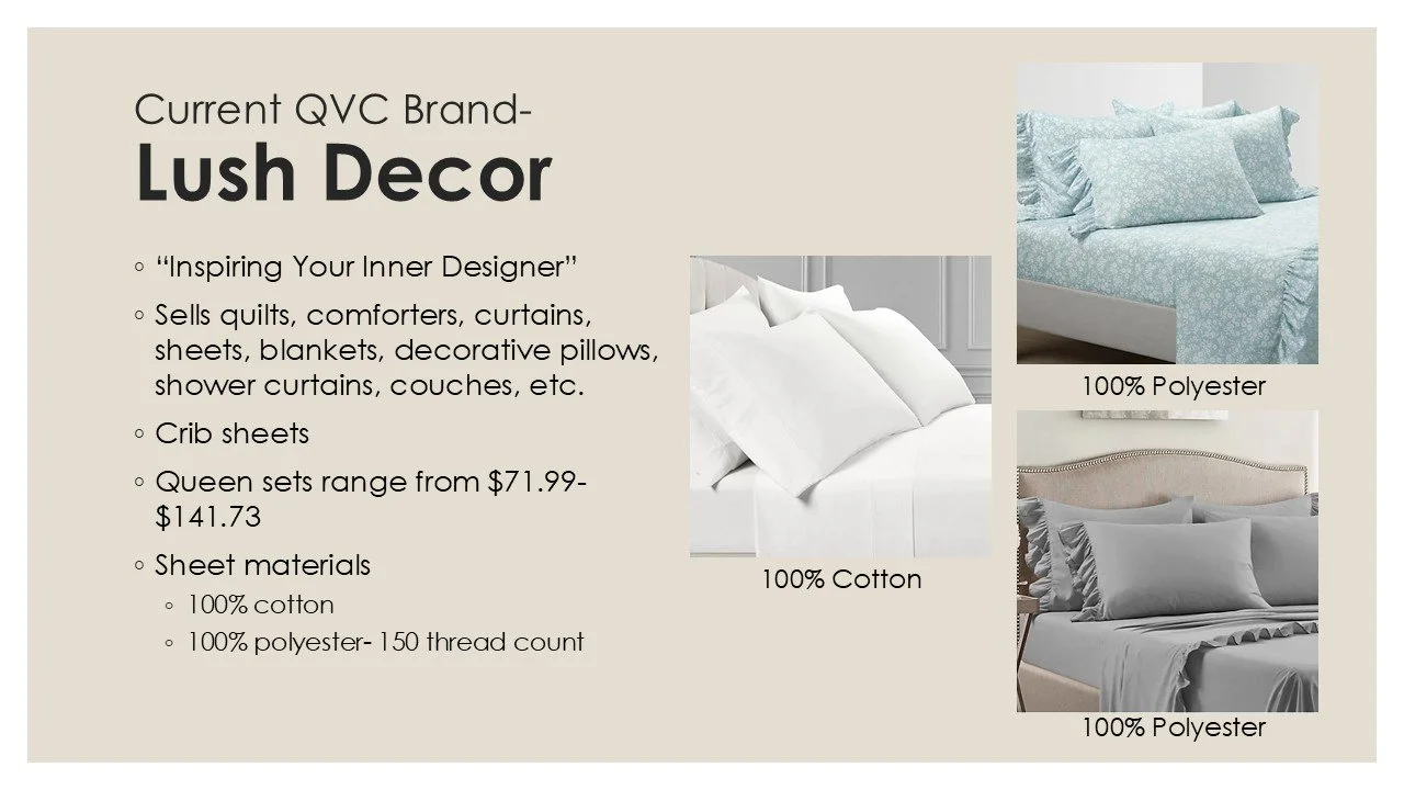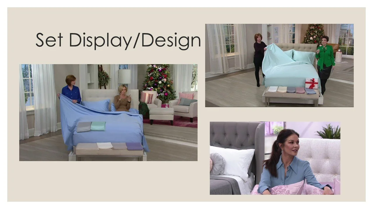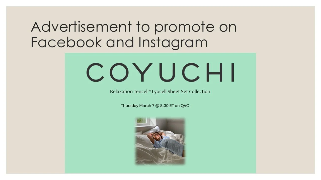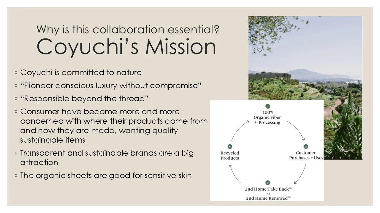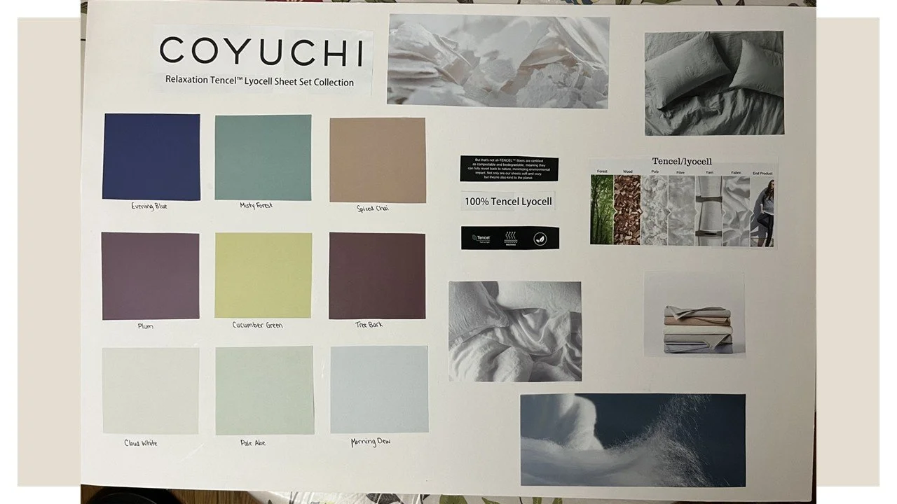 Collaboration between Coyuchi, an organic cotton bedding brand, and QVC. I created sheets designed to help people sleep and showcased how the sheets would be presented on QVC. This was the first major project in my Product Development class, the first class I took as part of my Buying and Merchandising specialization.