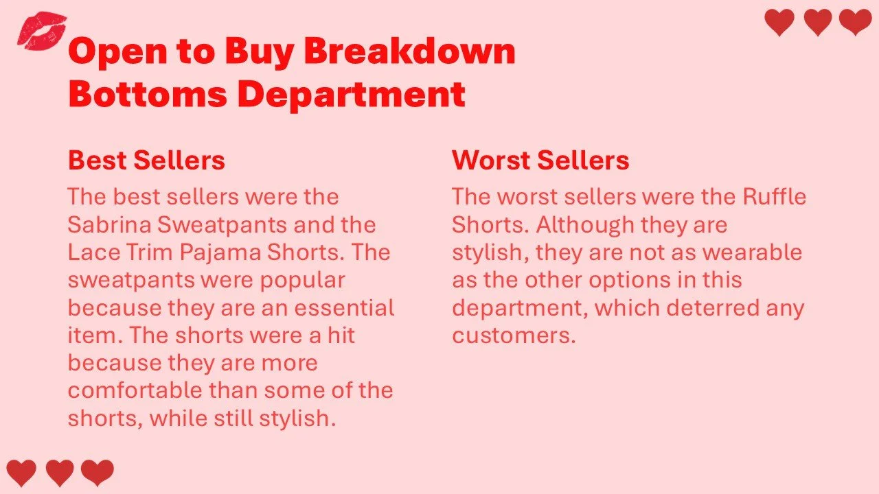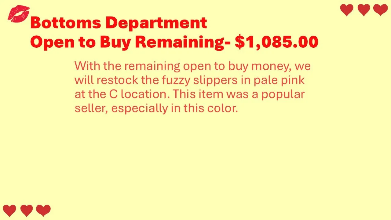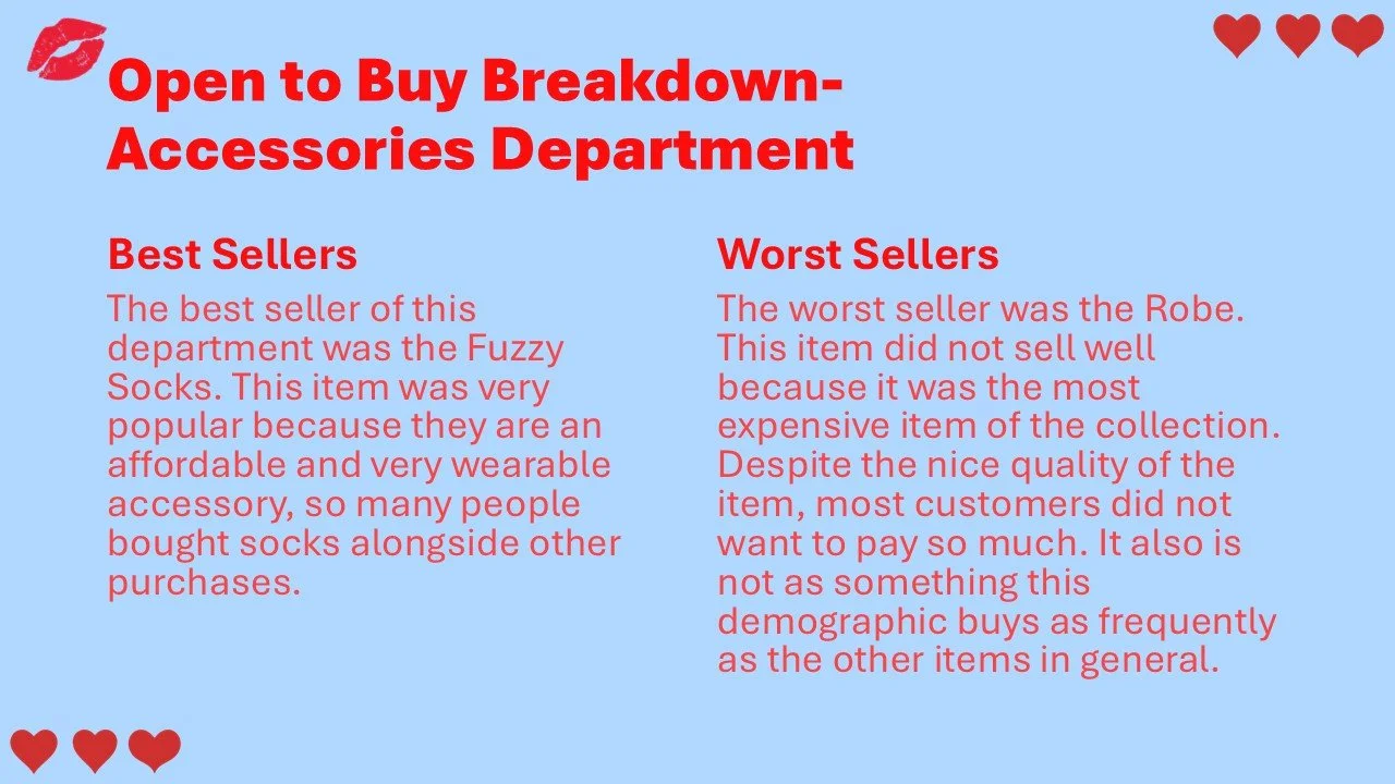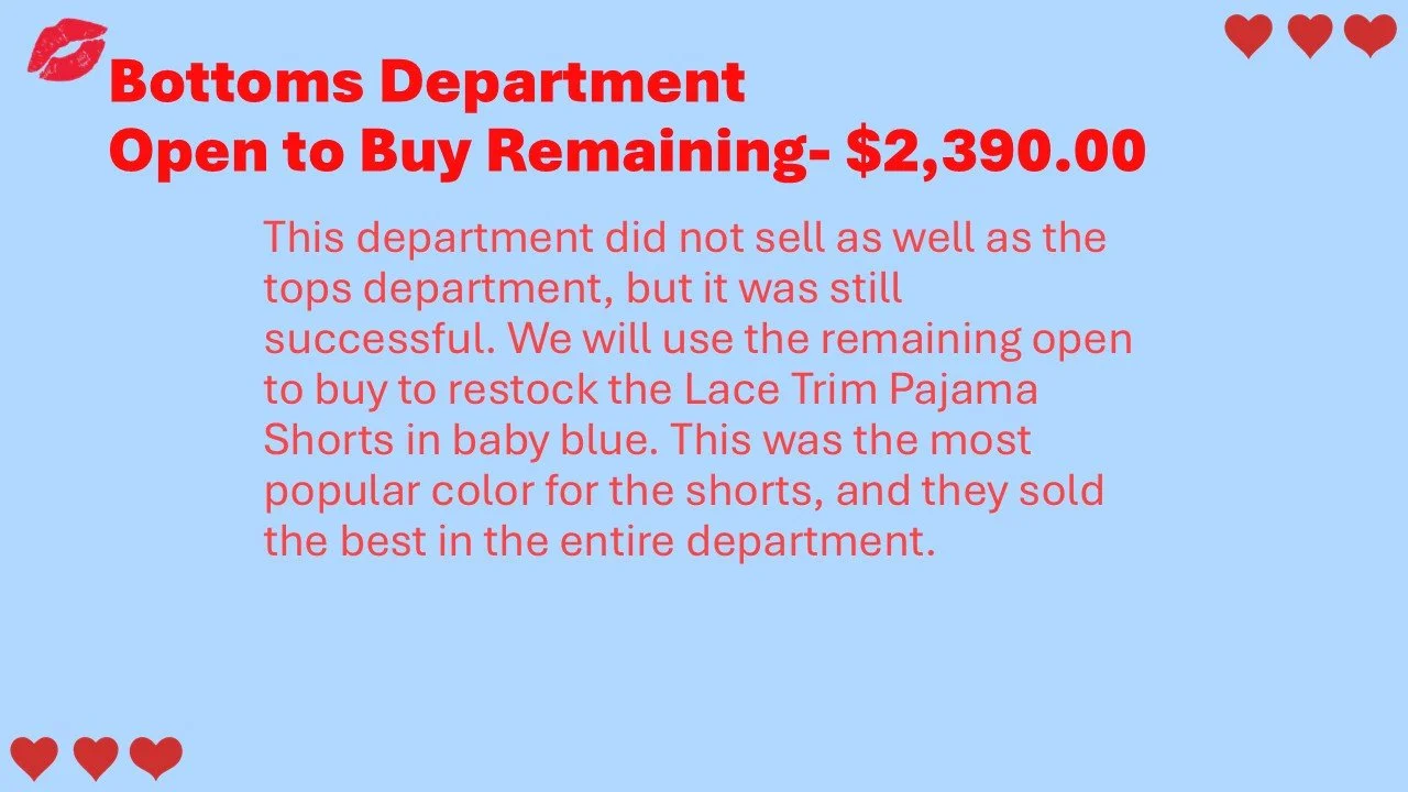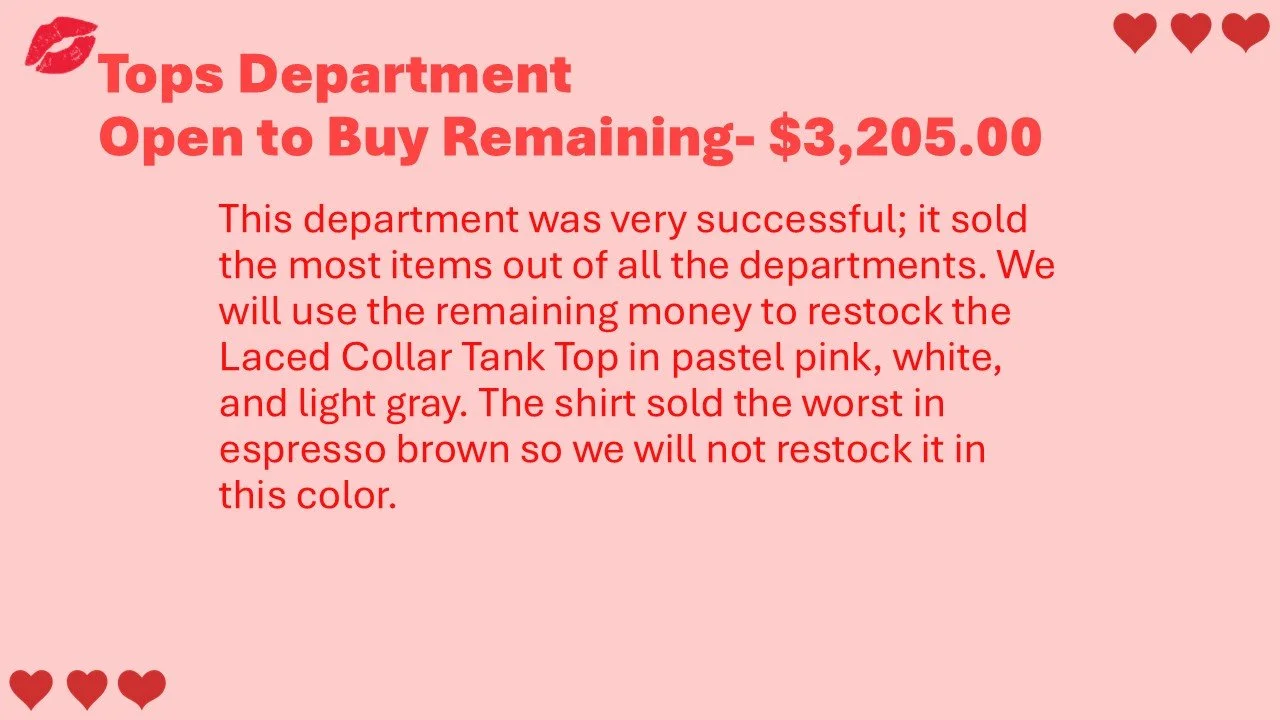 Final project in the class Buying and Merchandising, the second class I took for my specialization. We had to create a collaboration with a preexisting brand, decide on the products to be sold at 3 locations, and create an intricate line plan, and decipher where to allocate the remaining open to buy.